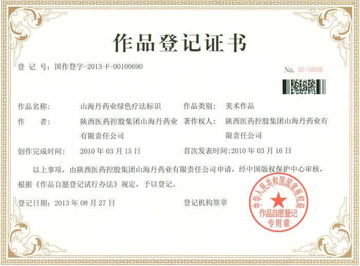 山海丹綠色療法標(biāo)示知識產(chǎn)權(quán)證書