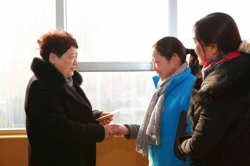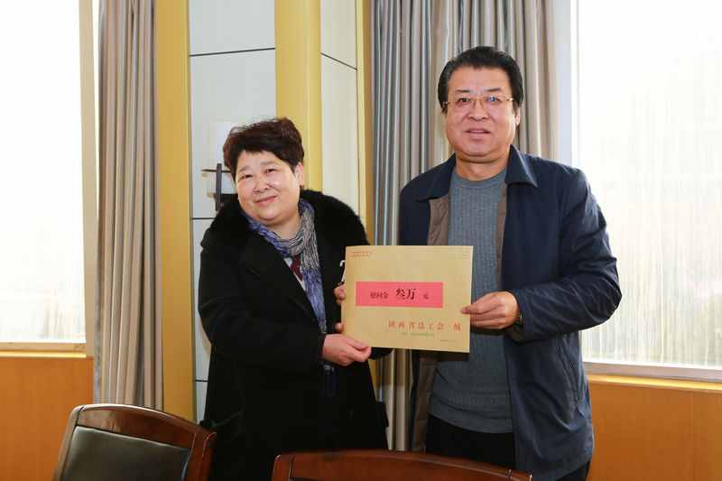 省總工會女工委主任李秀華將慰問金交到董事長、黨委書記劉如斌手中