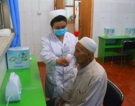 護(hù)士為當(dāng)?shù)鼗颊哌M(jìn)行霧化吸入治療